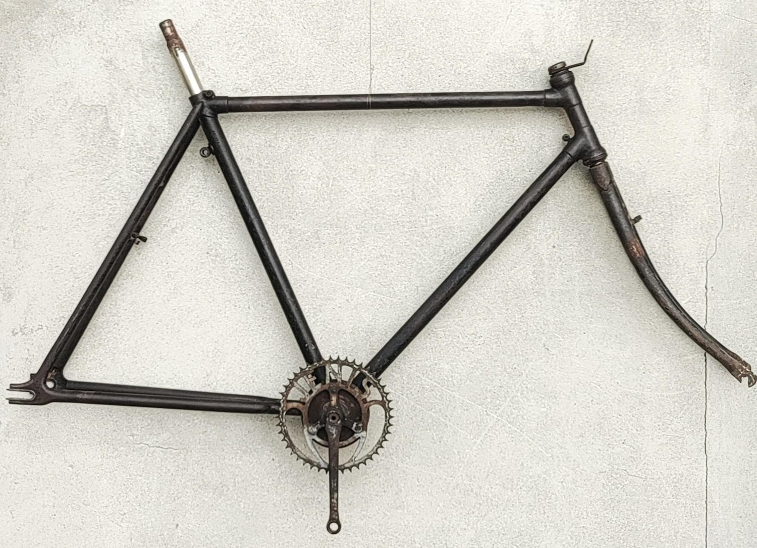 Telaio particolarissimo con doppio tubo incurvato, predisposto per freni a tamburo. La poca cromatura sopravissuta segna un buon rapporto estetico con la parte sottostante a ferro.